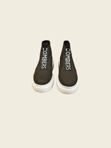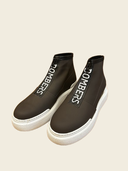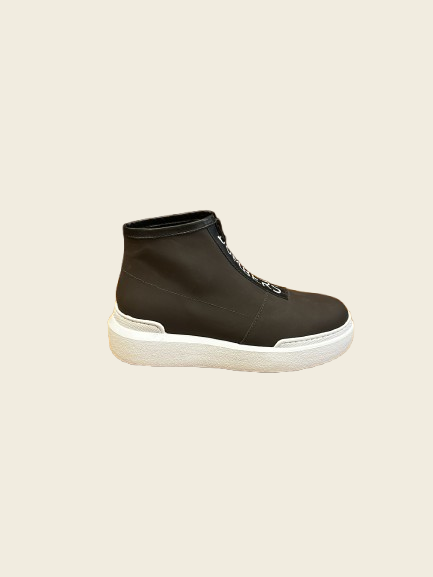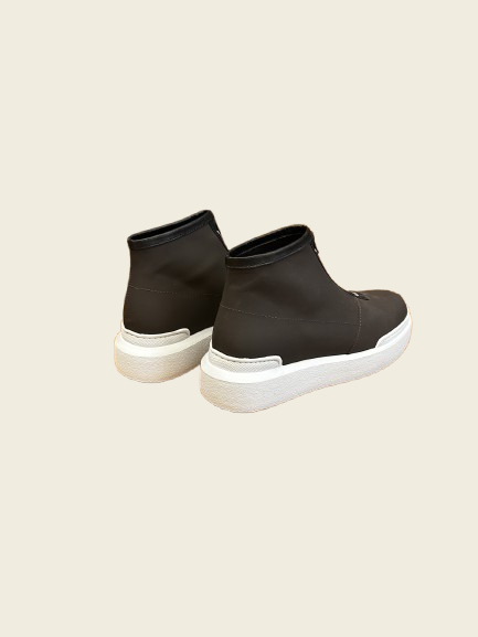 Zapatillas de piel engomadas marrones con cremallera en el empeine. Suela blanca de unos 3cm de altura aproximadamente.