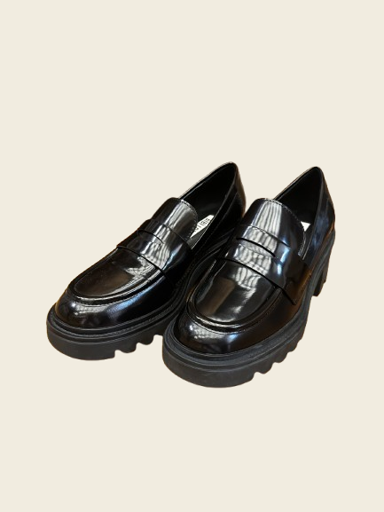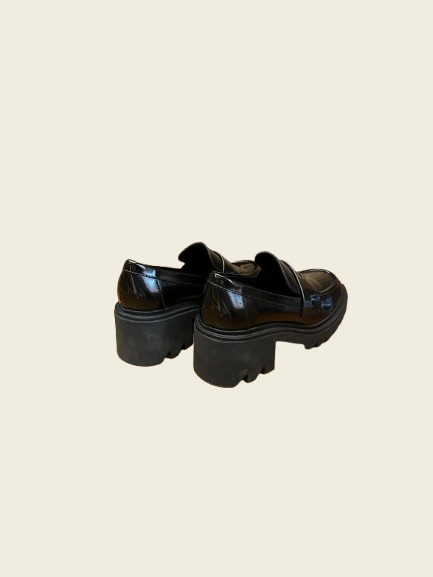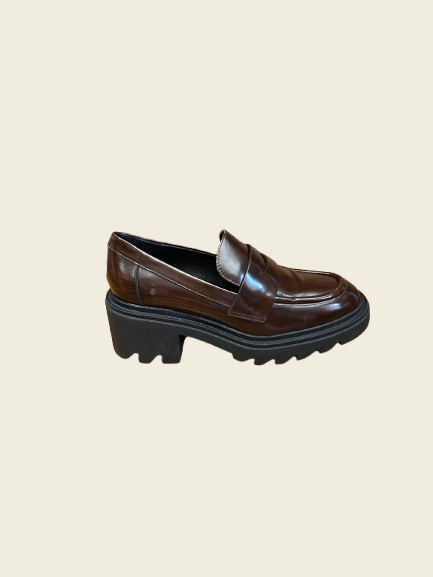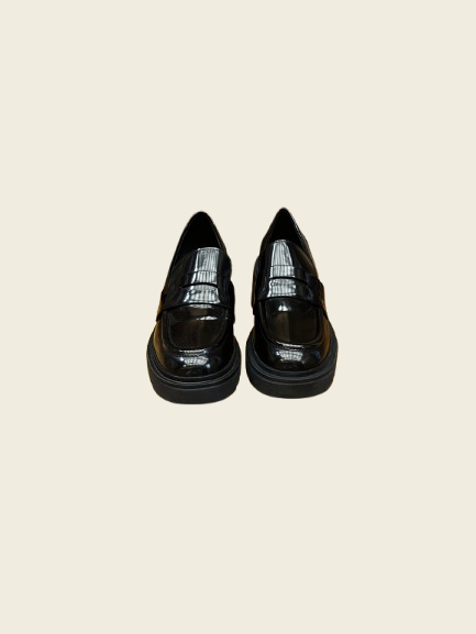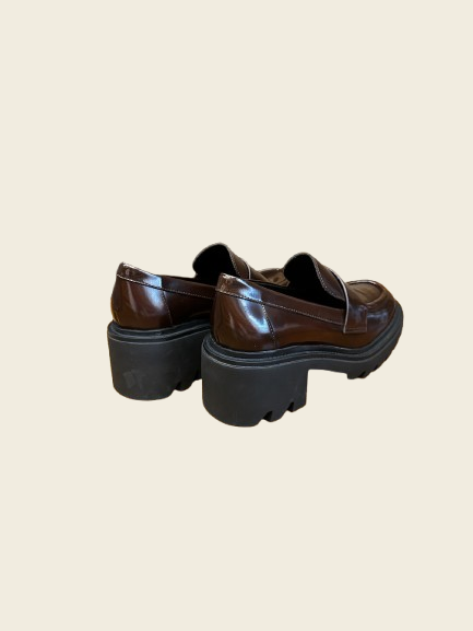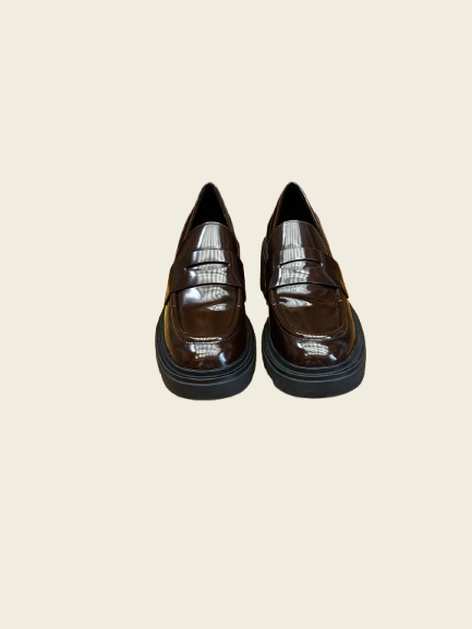 Mocasines de piel en marrón y en negro. Suela de goma desdentada con tacón. Adorno de antifaz.