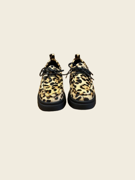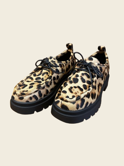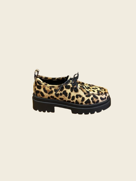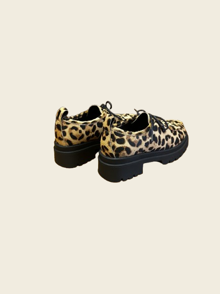 Zapatos en piel de potro con estampado leopardo y cordones. Doble suela de tacos