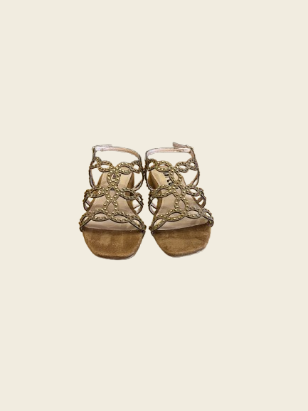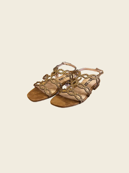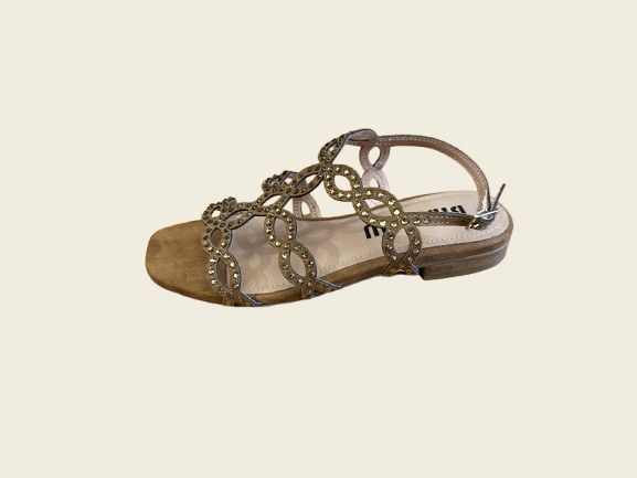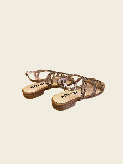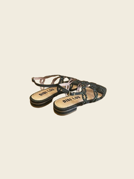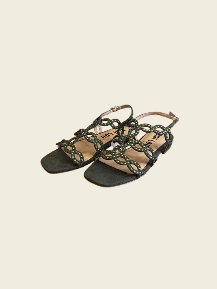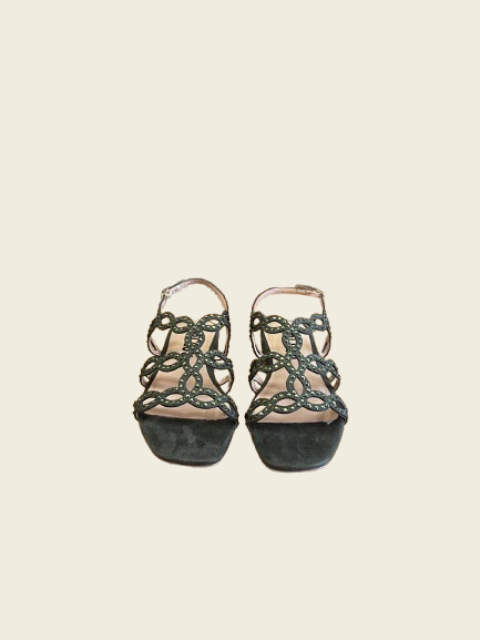 Sandalias de tiras con strass en antelina y piel. Cierre con hebilla en el talón. Altura del tacón de unos 2cm aproximadamente.