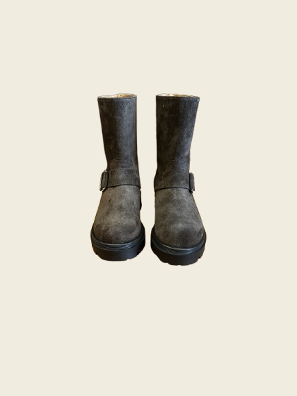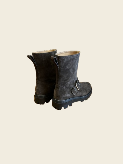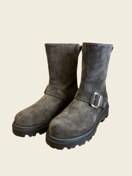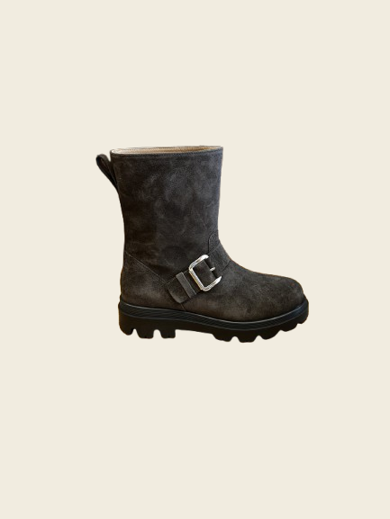 Bota en serraje marrón. Caña ancha con suela de tacos. Adorno hebilla sin cremallera.