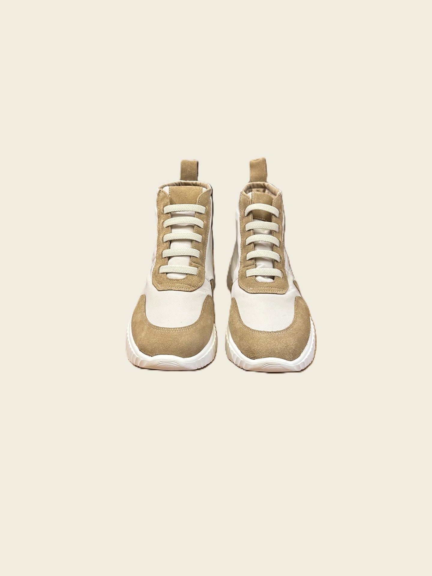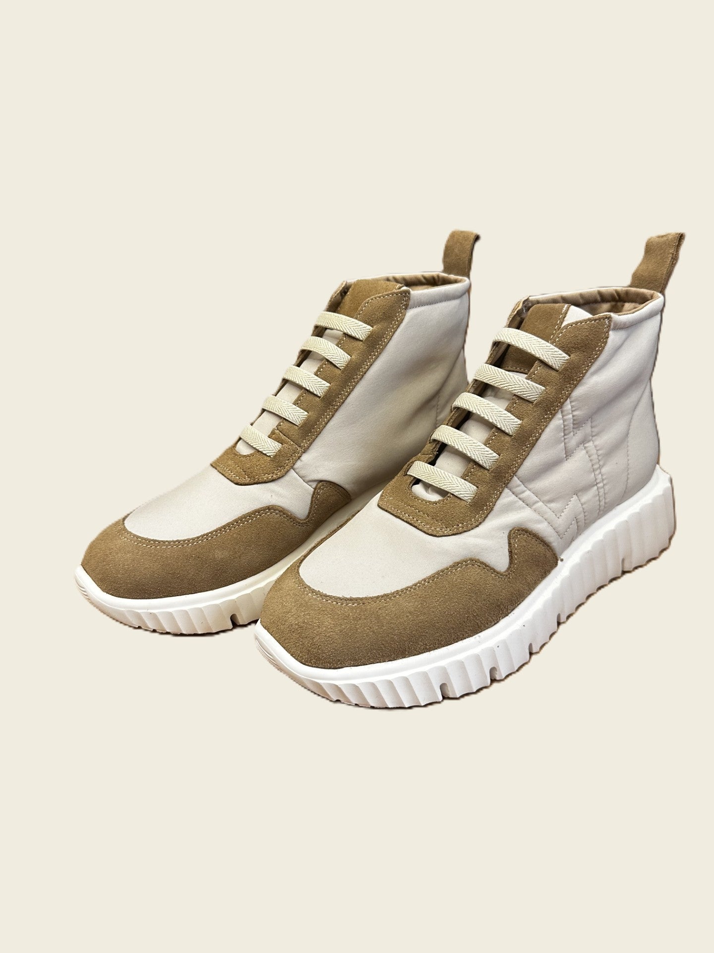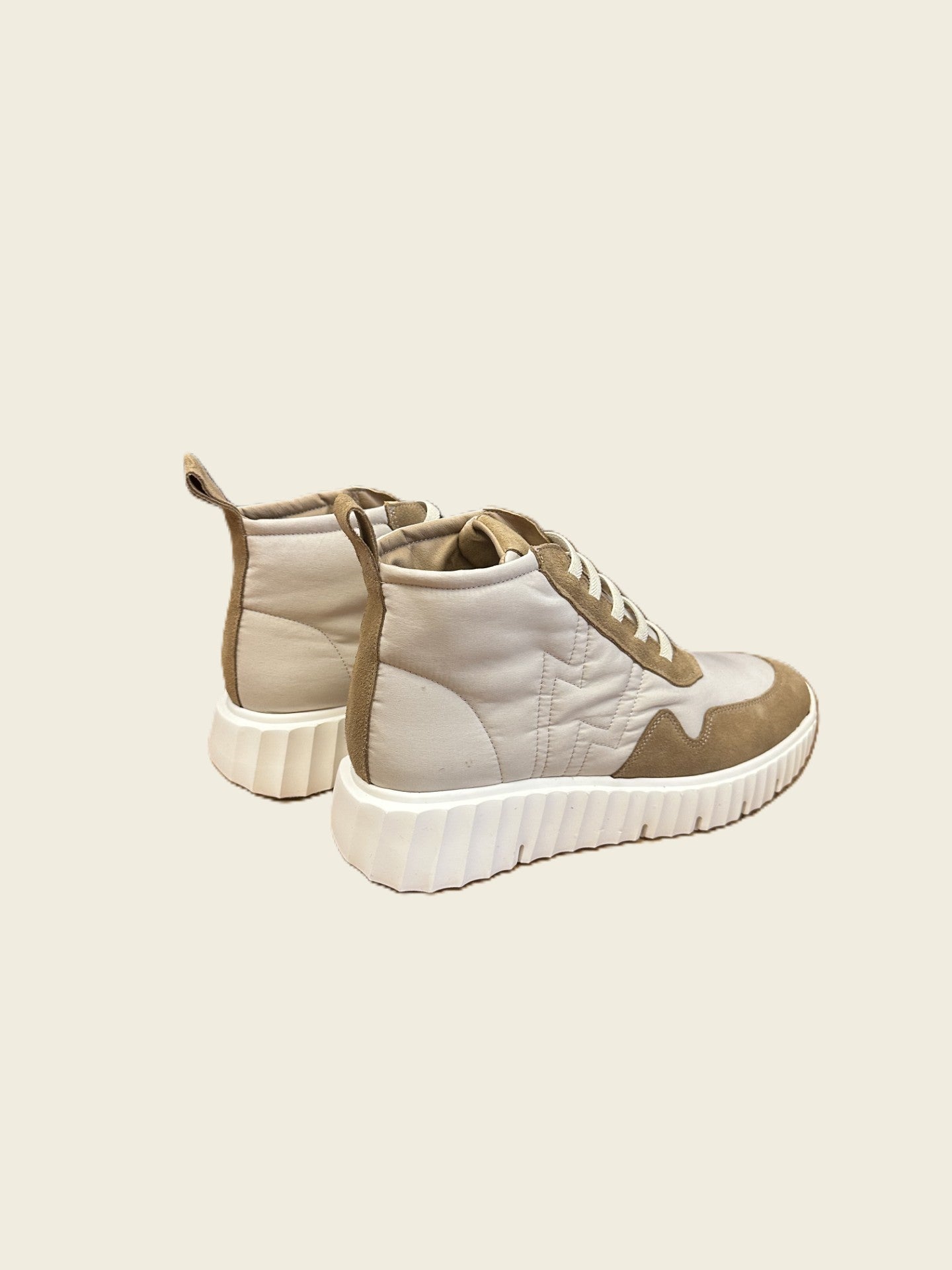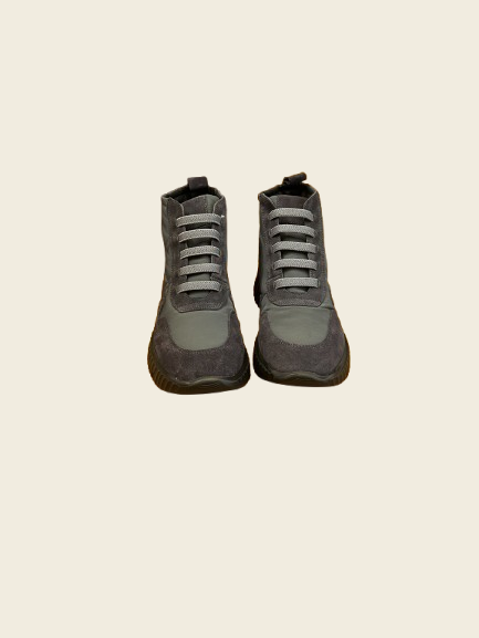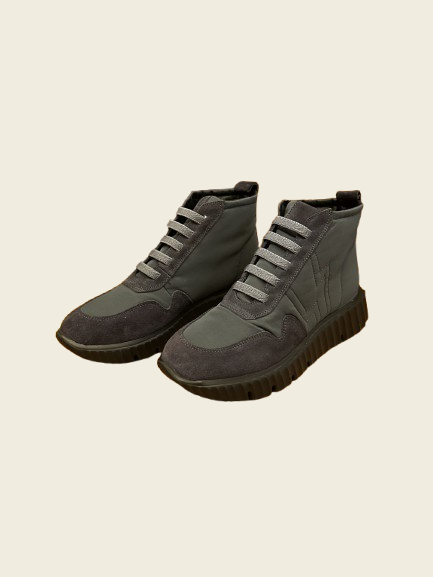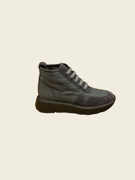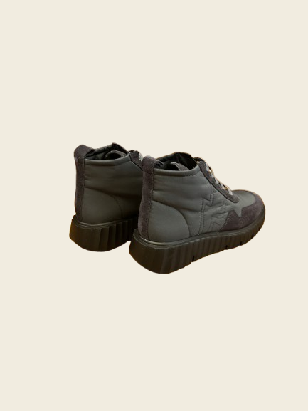 Zapatilla abotinada de piel combinada con tejido. Cordones elásticos. Suela con cuña de unos 3cm de altura aproximadamente.