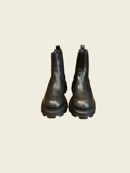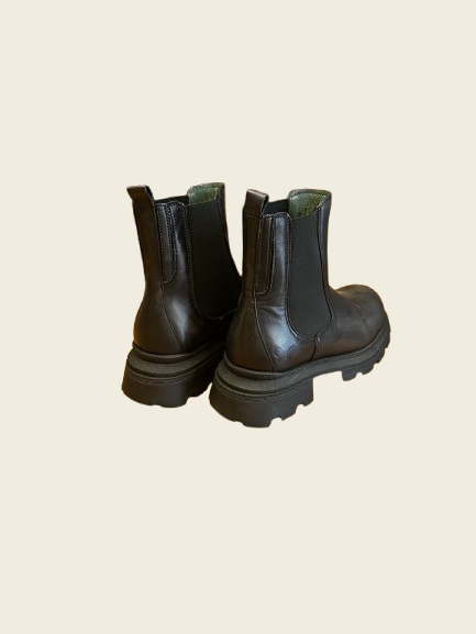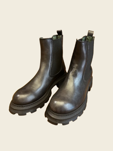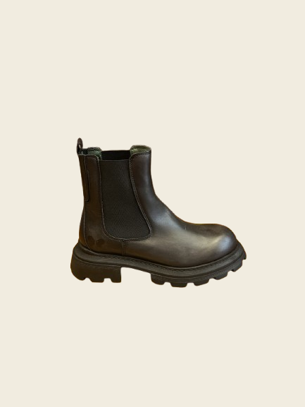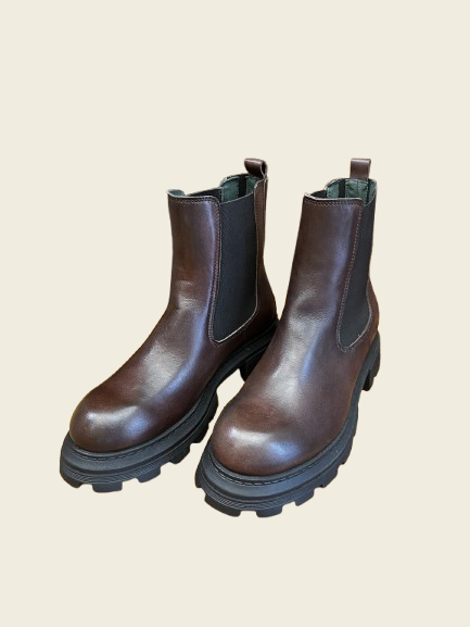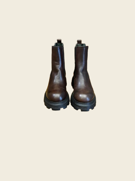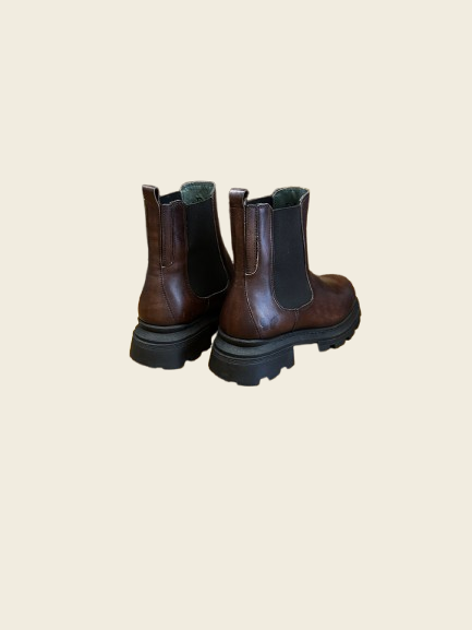 Botín de napa en marrón y negro. Suela de goma desdentada. Lateral en elásticos negro.