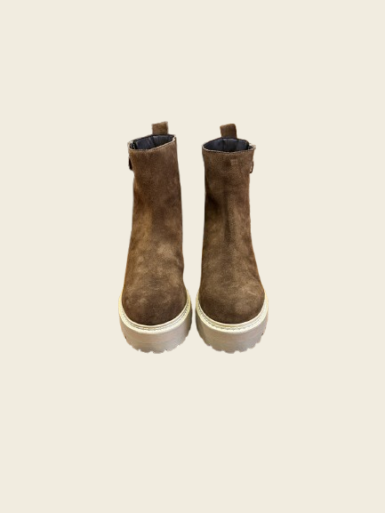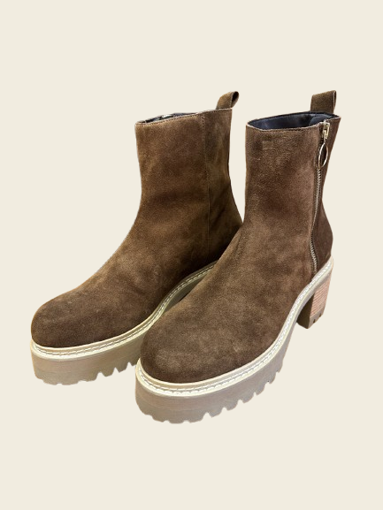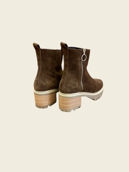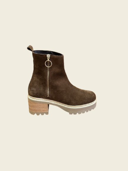 Botín de serraje con suela de plataforma con tacos. Cremallera dorada exterior.