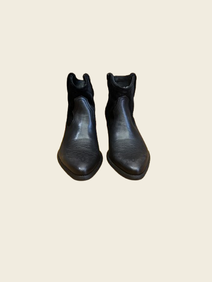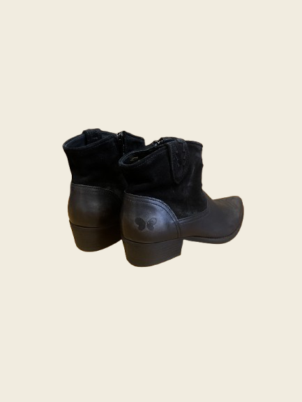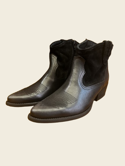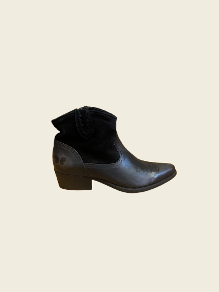 Botín campero negro de caña al tobillo combinado en napa y serraje. Puntera de pico y tacón cubano de unos 4cm de altura aproximadamente.